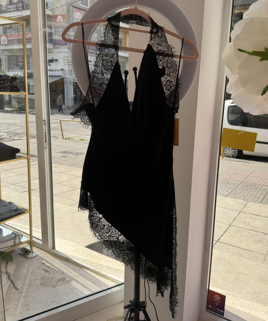 Λινζερι Μαύρο ντραπέ one size καλύπτει από small έως large με κορδόνι στο λαιμό από δαντέλα ασύμμετρο και στο τελείωμα δαντέλα σκίσιμο στο πλάι με δαντέλα