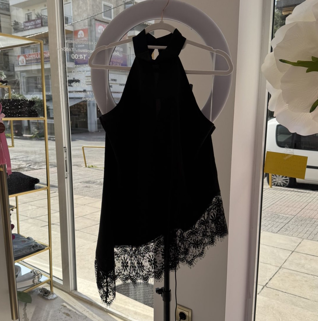 Σατέν μαύρη ασύμμετρη μπλούζα one size στο τελείωμα δαντέλα, δένει στο λαιμό με κουμπί